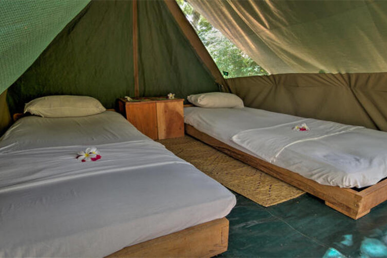 Breezy bandas, private rooms, tents, and dorms—each designed for calm